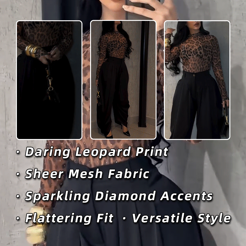 Step into the room and command every gaze with our leopard print mesh top. This isn't just a top; it's a statement. Designed for the fearless fashionista who loves to blend edgy glamour with irresistible allure, this piece features a bold, all-over leopard print on a sheer mesh fabric, artfully adorned with a scattering of sparkling diamond-like details.