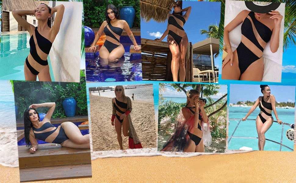 This one-shoulder swimsuit is cut in the waist area, with mesh and see-through cutout design, color block stitching and classic slim fit, giving you a unique look that is very sexy and charming.