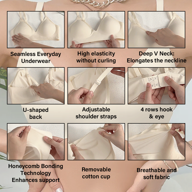 Deep V-cup design + seamless fabric, naturally gathers and shapes the bust, creating a refined silhouette without showing bra lines, suitable for low-cut clothing;
