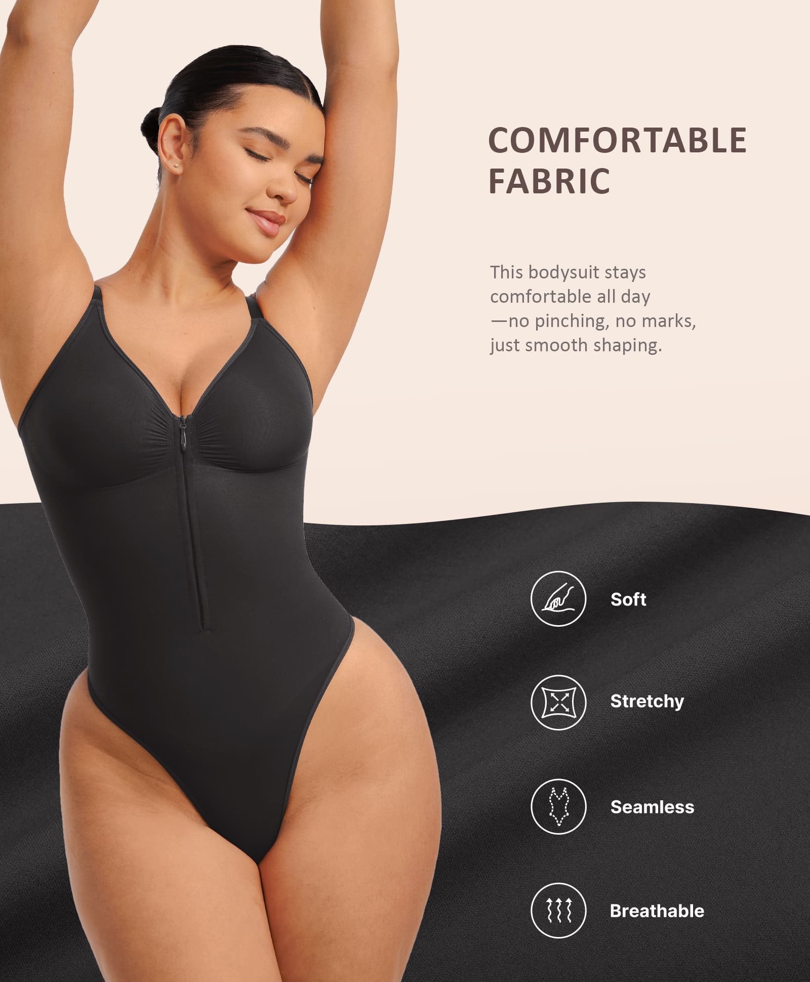 Plus-size friendly easy-wear system: The innovative zipper with nine built-in hooks and crotch snap closure ensures dual security, while the inner skin-friendly flap prevents metal friction, eliminating the discomfort of traditional shapewear.
