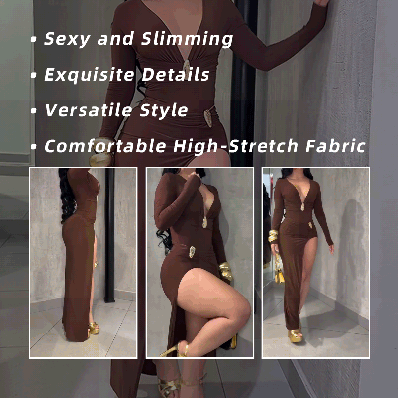 • Design Highlights: The top is a triangle jumpsuit, and the bottom is a slit maxi skirt. The deep V-neck and high-stretch, fitted cut accentuate your curves; the high slit elongates the legs, adding a touch of sexiness; metallic embellishments at the neckline and waist add a touch of sophistication.