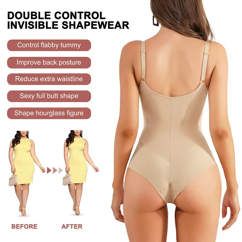 - V-neck bodysuit shapewear with adjustable straps, hourglass bra shapewear with V-neck bra and adjustable straps. This seamless tummy control shapewear is adjustable to fit the body perfectly, as the slimming bodysuit can be removed as a strapless shapewear bodysuit or worn as a cross-bodysuit top. The straps of the comfort support bodysuit can be replaced with transparent straps for off-shoulder dresses. This sturdy bodysuit makes you more attractive and shows your feminine charm under any clothes.